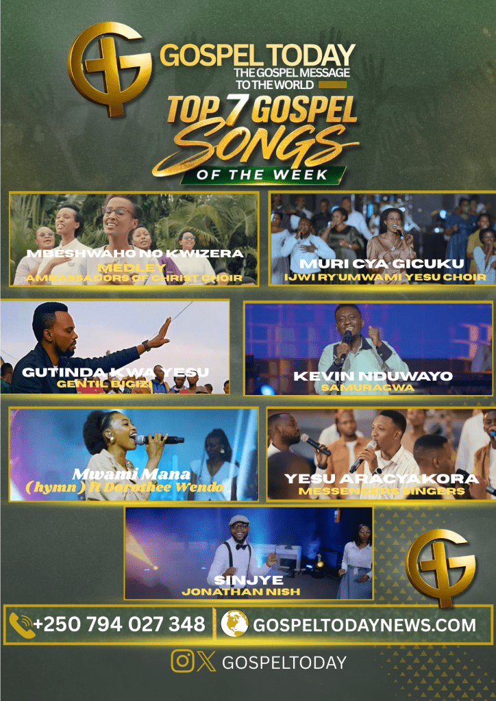 Nk’uko bisanzwe, Gospel Today ibagezaho urutonde rwa TOP 7 Gospel Songs of The Week, rutegurwa buri wa Gatanu, rugamije kugaragaza indirimbo nshya ziyoboye izindi mu kwamamara no mu butumwa bwiza zitanga.