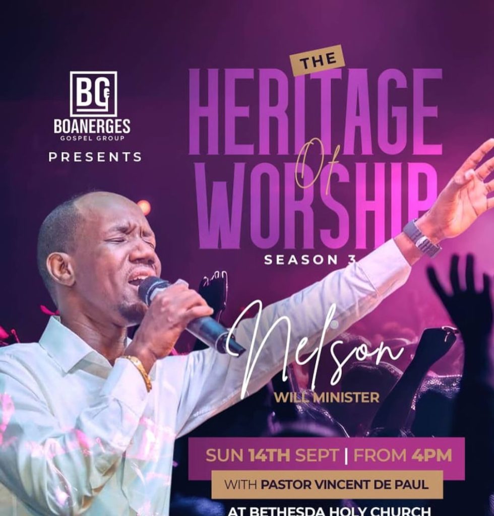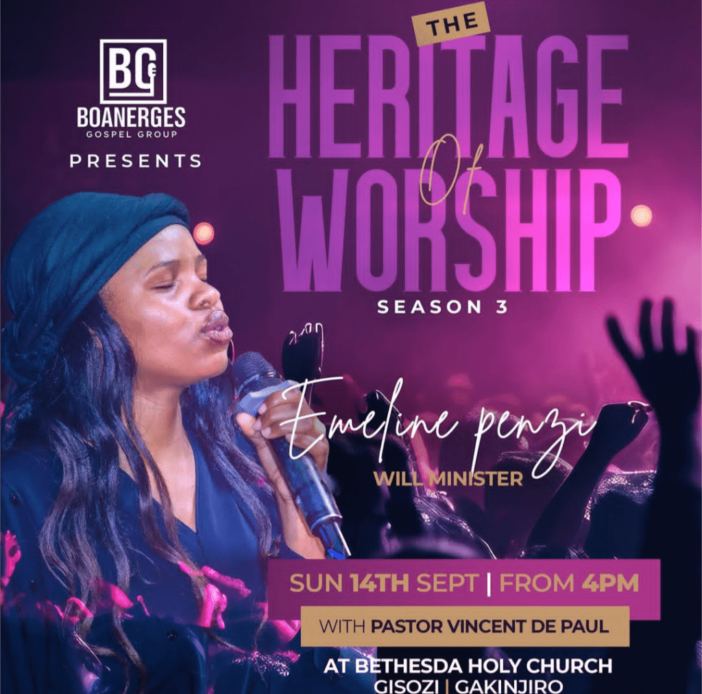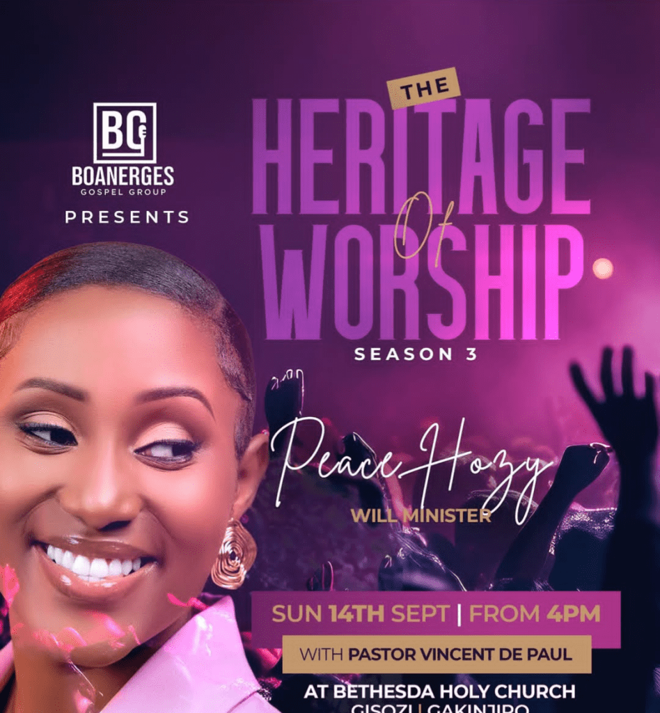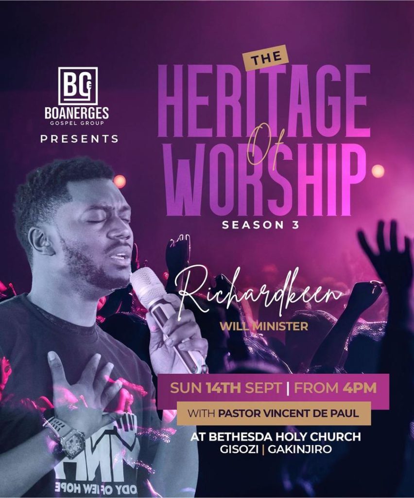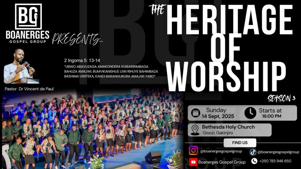 Igitaramo cyihariye “The Heritage of Worship Season 3” ya Boanerges Gospel Group, itsinda rizwi cyane mu ndirimbo zo guhimbaza Imana, ryateguye igitaramo gikomeye cyiswe The Heritage of Worship Season 3,kizabera kuri Bethesda Holy Church, Gisozi–Gakinjiro ku itariki ya 14 Nzeri 2025 guhera saa kumi n’ebyiri z’umugoroba (16h00).