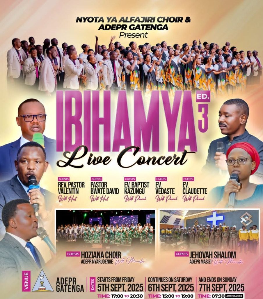 Korali Nyota ya Alfajiri ibarizwa muri ADEPR Gatenga yateguye igitaramo gikomeye cyiswe IBIHAMYA Live Concert Edition ya 3, kizabera kuri ADEPR Gatenga kuva ku itariki ya 5 kugeza ku ya 7 Nzeri 2025. Iki gitaramo kitezweho guhuriza hamwe abaririmbyi, abashumba n’abakirisitu mu kuramya no guhimbaza Imana mu buryo budasanzwe.Iki gitaramo kizatangira ku wa Gatanu tariki ya 5 Nzeri 2025 guhera saa kumi n’imwe z’umugoroba (17:00) kugeza saa mbili n’igice z’ijoro (20:30).