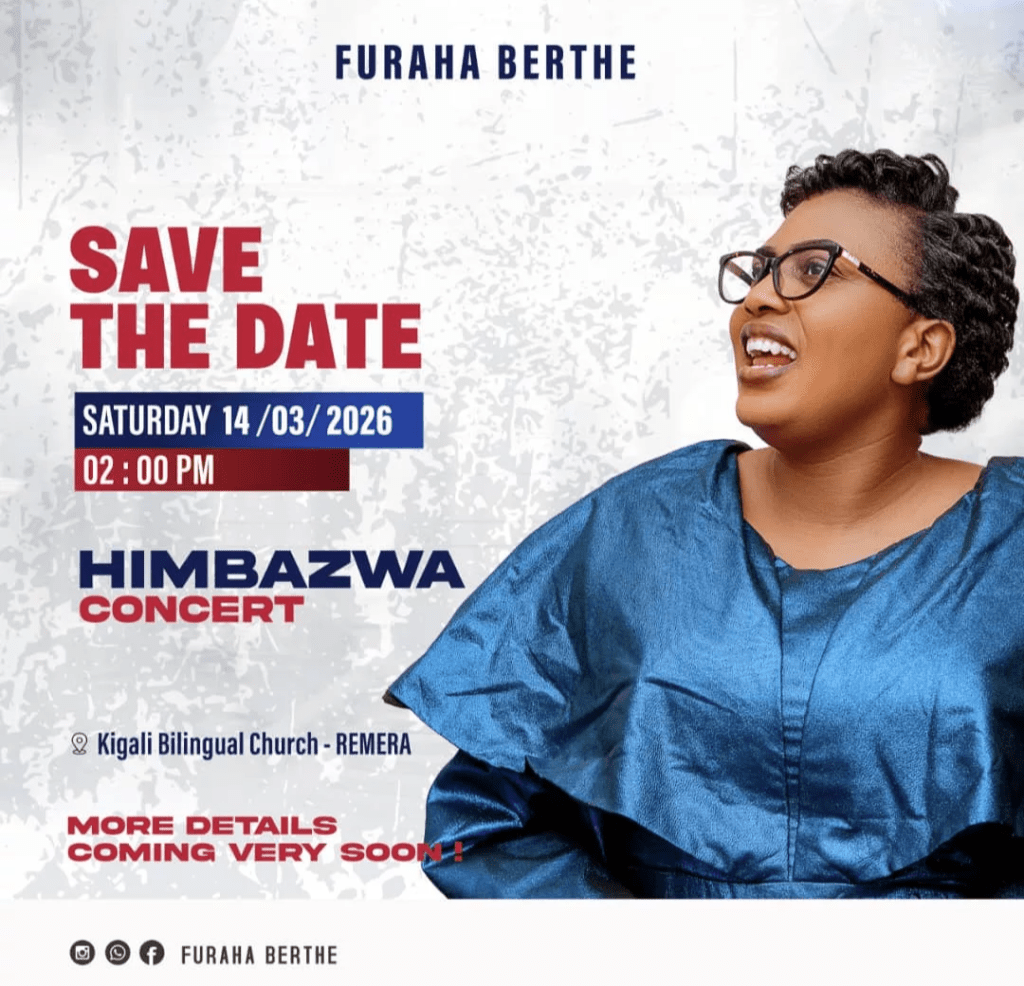 Umuramyi Furaha Berthe, yatangaje ku mugaragaro igitaramo gikomeye yise “Himbazwa Concert”, kizaba kw’isabato tariki ya 14 Werurwe 2026 saa munani z’amanywa (02:00 PM). Iyi ni imwe mu mishinga ikomeye ateganya gukorera abakunzi be b’umuziki wo kuramya no guhimbaza Imana.Iki gitaramo kizabera muri Kigali Bilingual Church – Remera ahazwi nk’ahantu hasanzwe hakirirwa ibitaramo n’ibikorwa by’iyobokamana bifite ireme.